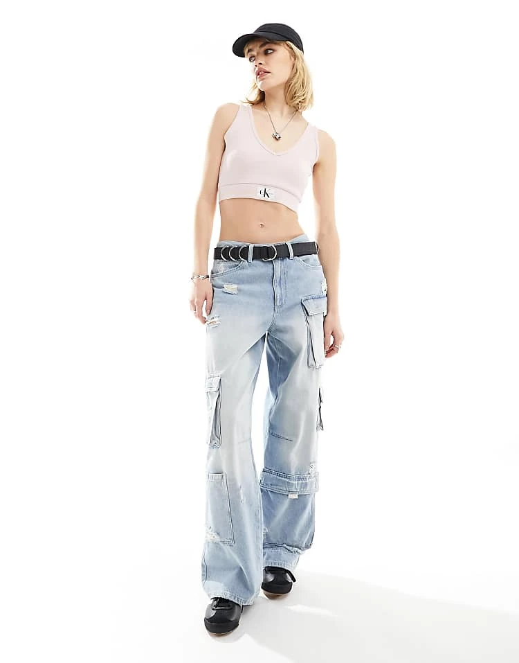 Calvin Klein Jeans Woven Label Rib Crop V-neck Top In Pink For Women Sepia Rose