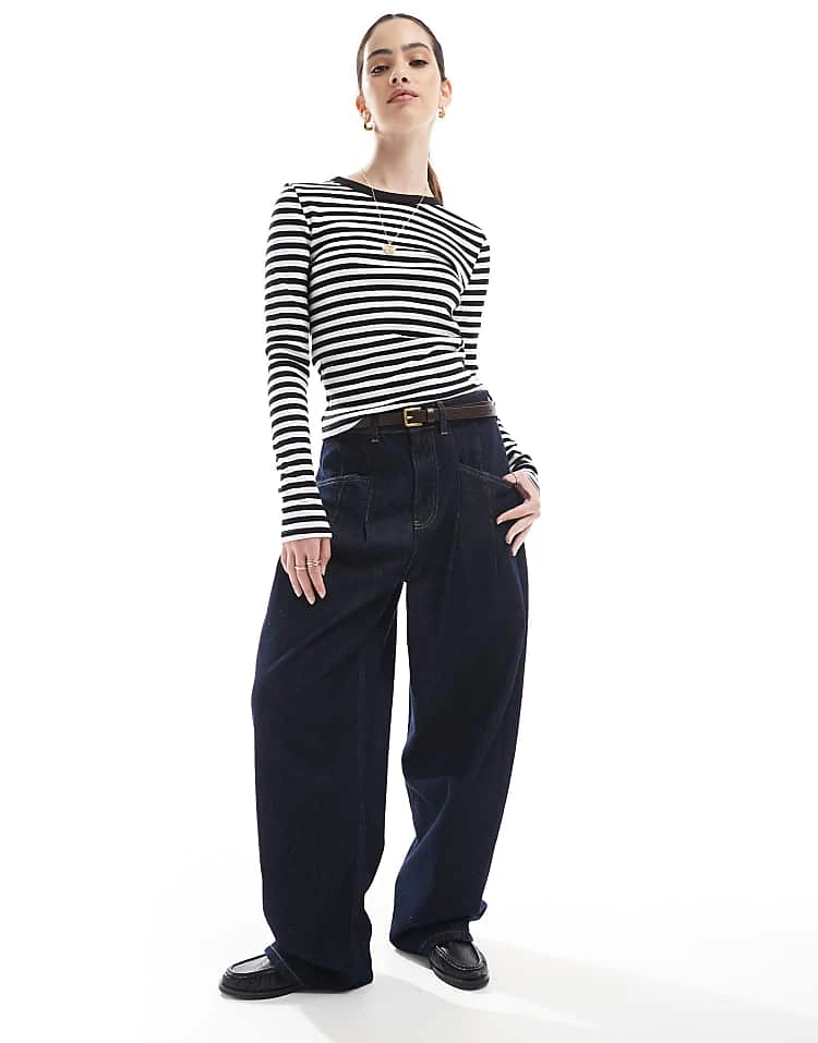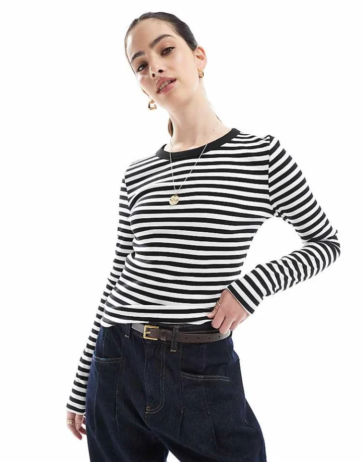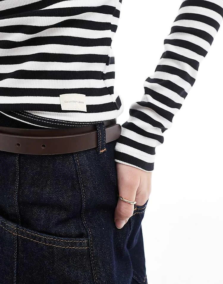 Calvin Klein Jeans Woven Label Stripe Long Sleeve Rib T-shirt In White & Black For Women Black / White