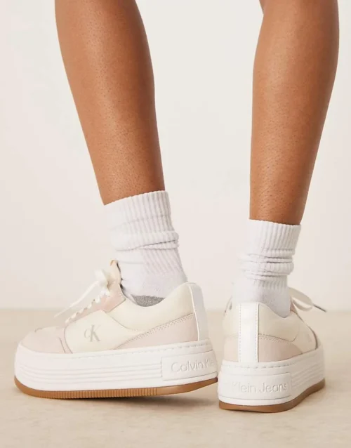 Calvin Klein Jeans Flatform Trainers In Off White With Gum Sole For Women Creamy White/ Pink