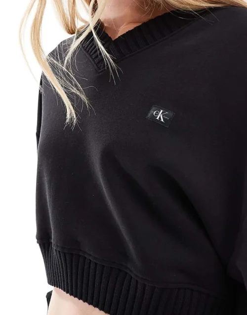 Calvin Klein Jeans Woven Label V-neck Sweatshirt In Black For Women Ck Black